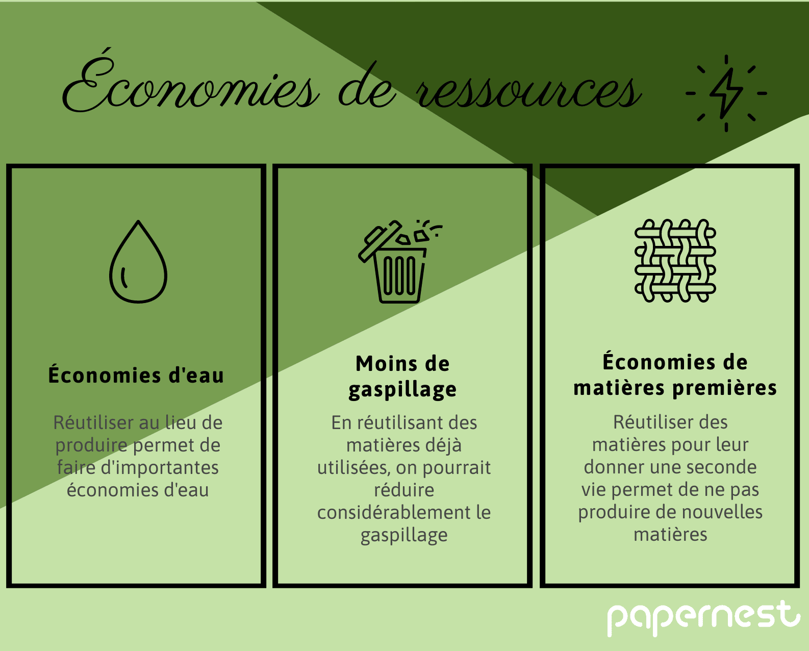 Sans surprise, l'upcycling permet de faire des économies de matières premières. Puisque les ressources sont sans cesse réutilisées pour créer d'autres produits, alors il n'y a plus besoin de nouveaux matériaux pour créer de nouveaux produits.Économies d'électricité