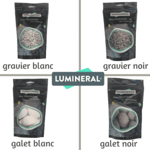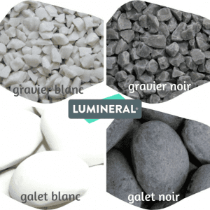 Lumineral se compose de 4 produits : des gravillons blancs et des gravillons noirs et des galets blancs et des galets noirs.